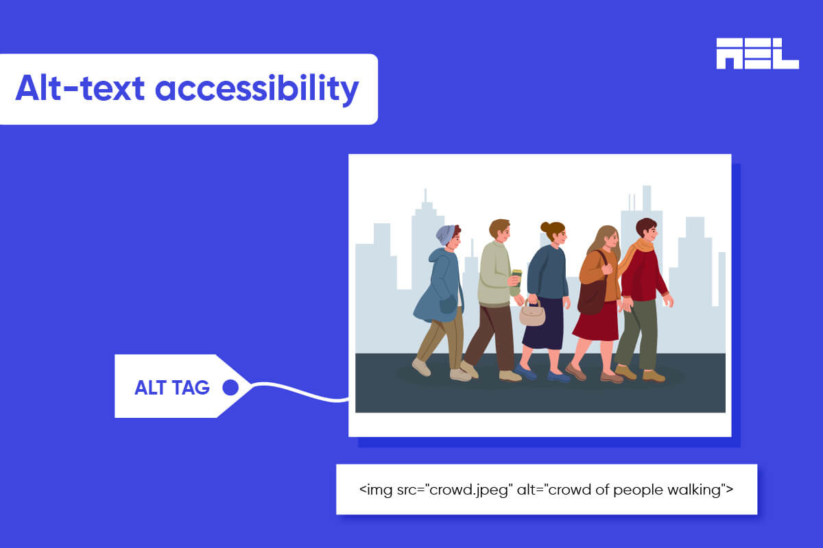 Illustration explaining alt-text accessibility with a photo of people walking and example HTML alt tag