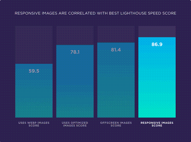 Responsive images have the strongest correlation with the best webpage speed scores according to Lighthouse assessments.