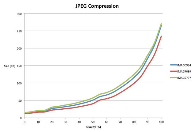 Graph showing how JPEG image quality percentage affects file size for different images during compression.