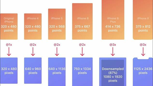 Comparison of iPhone screen points and pixels with Retina and higher density display scaling from original iPhone to iPhone X