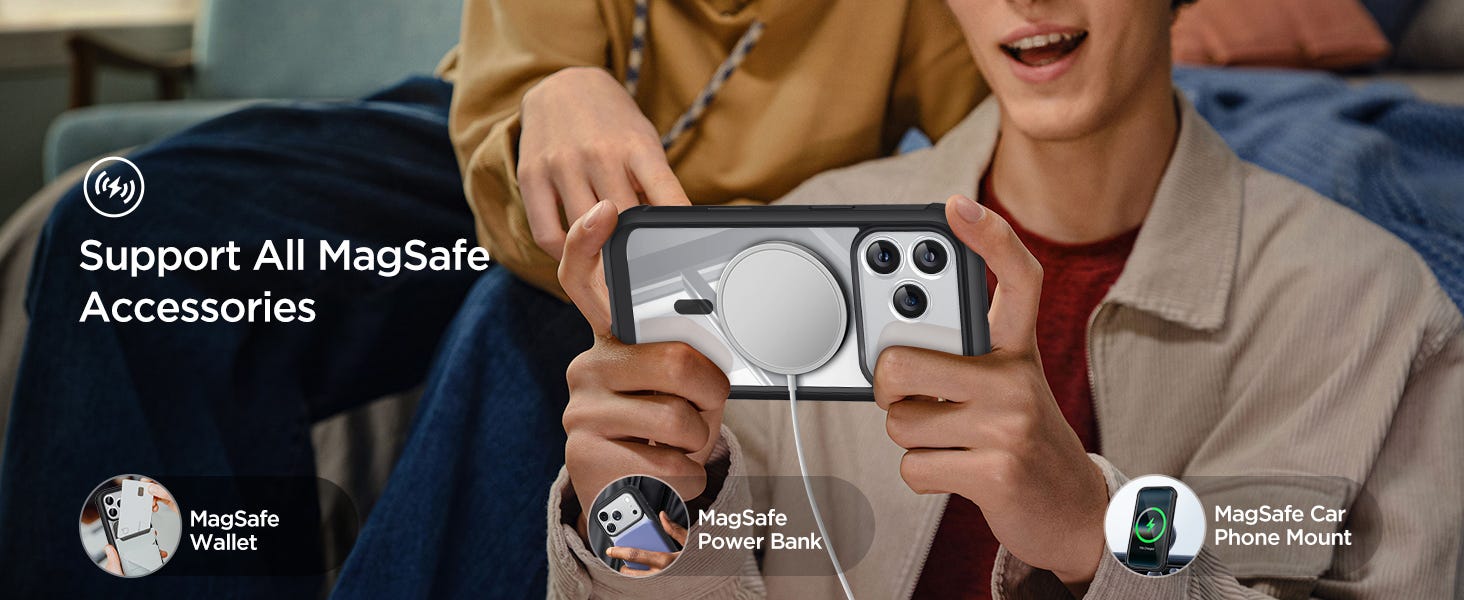 ম্যাগনেটিক অ্যাক্সেসরিজের যুগে, এই কভারটি সর্বশেষ প্রযুক্তির সাথে পুরোপুরি সামঞ্জস্যপূর্ণ। এতে সরাসরি বিল্ট-ইন আপগ্রেডেড থার্ড-জেনারেশন ম্যাগনেট রিং আছে, যা ম্যাগসেফ অ্যাক্সেসরিজের সাথে শক্তিশালী ও নির্ভরযোগ্য সংযোগ নিশ্চিত করে। এটি দ্রুত, সহজ আর নিরাপদ ওয়্যারলেস চার্জিং সম্ভব করে তোলে। শক্তিশালী ম্যাগনেটিক অ্যালাইনমেন্টের জন্য চার্জার যেকোনো অবস্থান থেকেই সহজে লাগে, আর ফোন থেকে খসে যাওয়ার ভয় থাকে না।