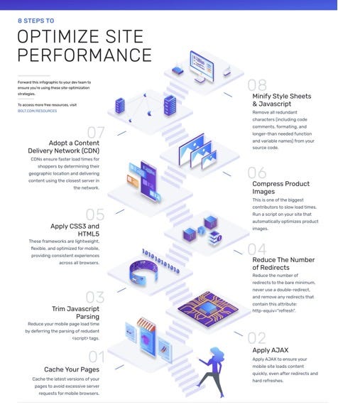 Infographic showing 8 key steps to optimize website performance for faster load times and better user experience.