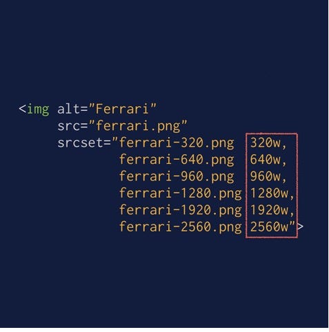 HTML img tag with srcset attribute specifying multiple responsive image widths for optimized loading.