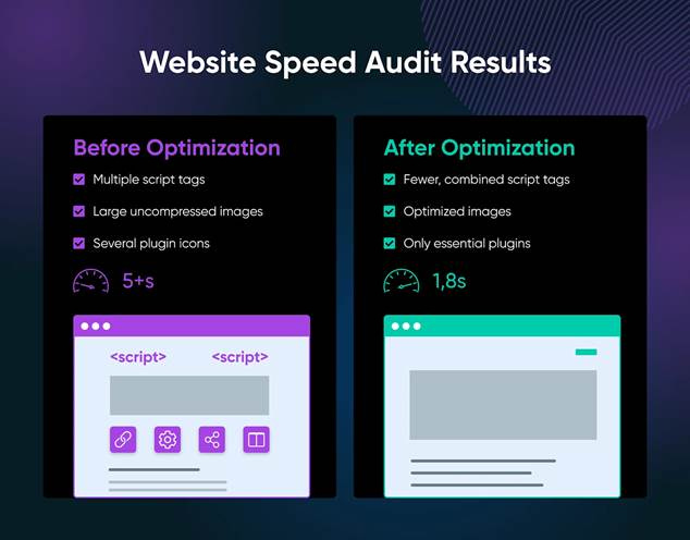 Comparison of website speed audit results before and after optimization showing reduced load time from over 5 seconds to 1.8 seconds.