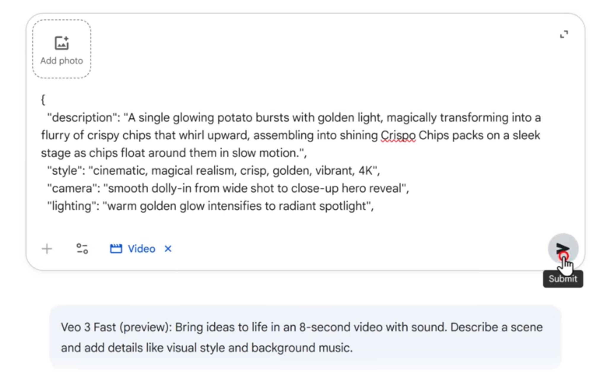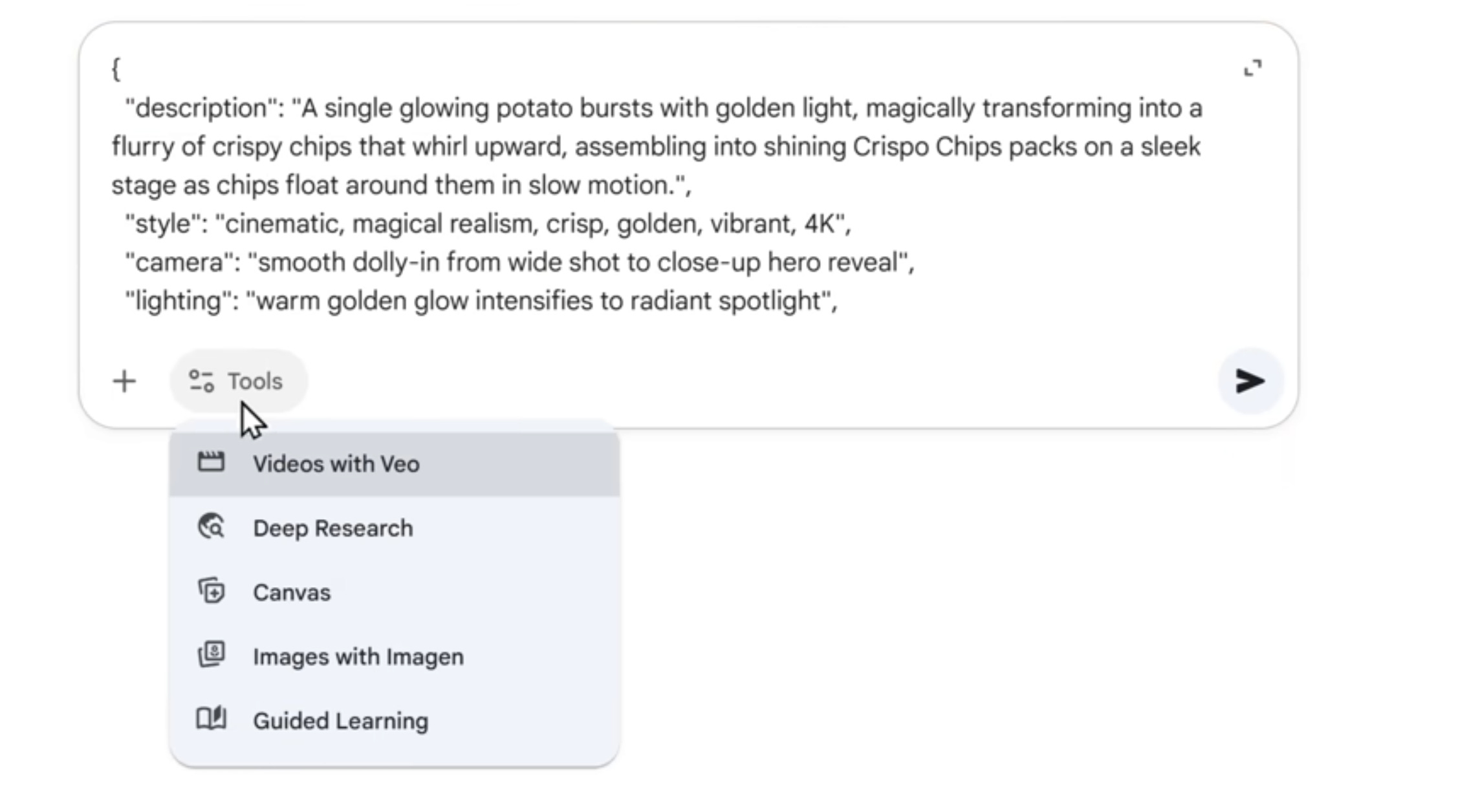 Upon successful creation of your JSON prompt, the subsequent phase, and arguably the most exciting, entails generating the actual VFX video. To generate the VFX video utilizing your meticulously crafted JSON prompt, The Transcendent team will primarily employ Gemini, a robust and intuitive platform ideal for converting our detailed prompt into an impressive VFX advertisement. Gemini’s advanced capabilities make it perfect for interpreting complex instructions and rendering high-quality visual outputs.