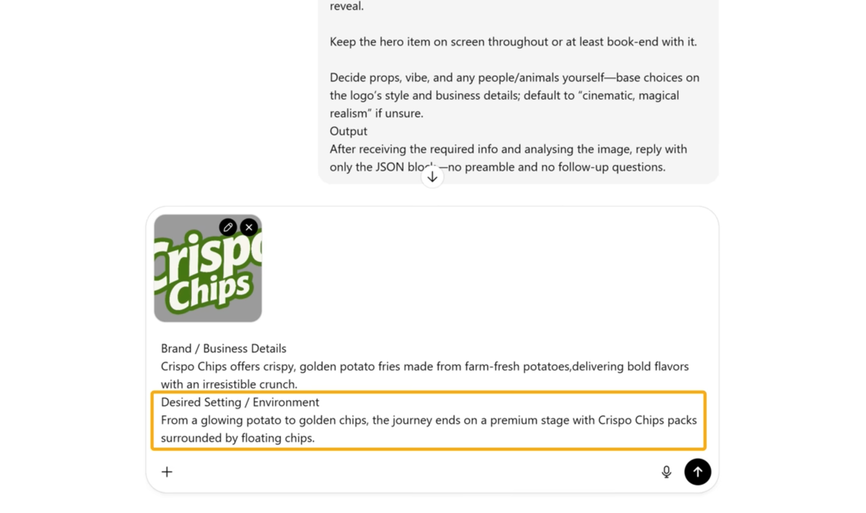Automatically analyse the uploaded image (colours, shapes, style cues, product hints, any visible text) and combine these findings with the business details to craft the Veo3 prompt.