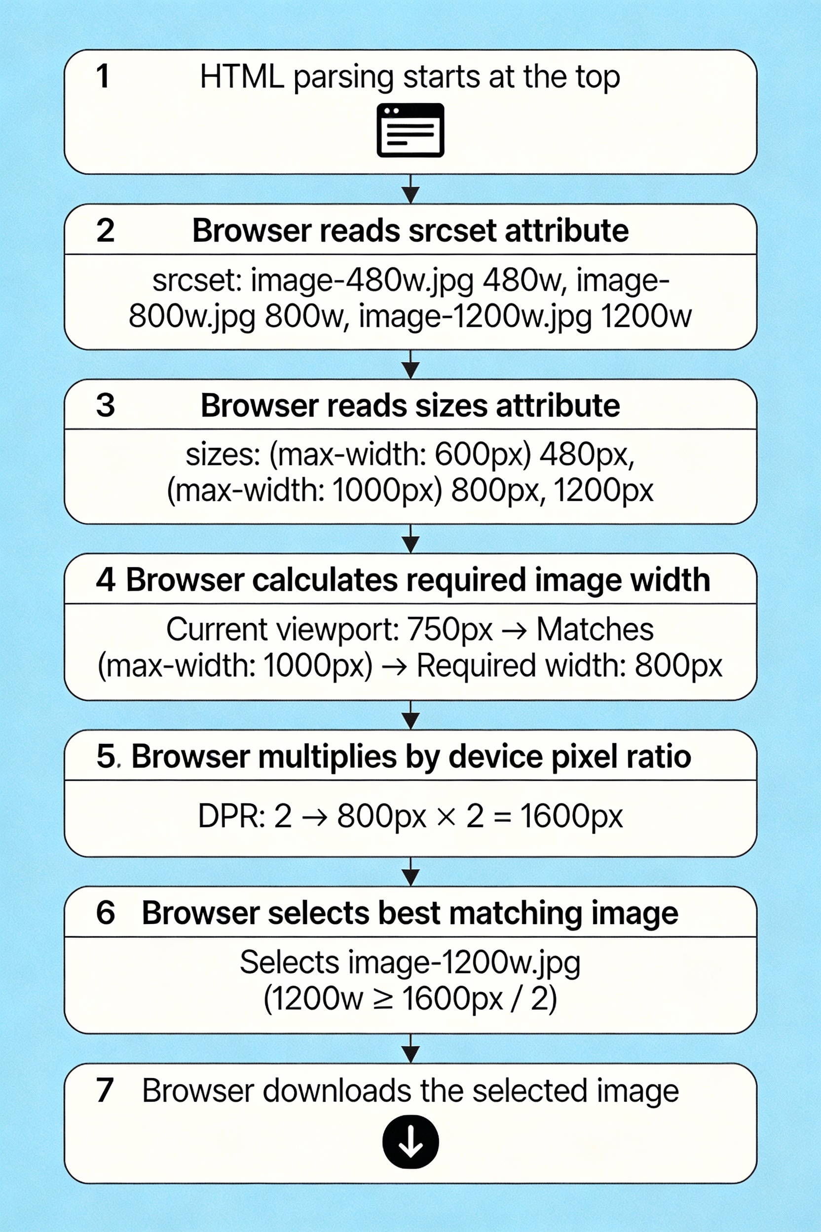 The browser image selection process is actually very rational and efficient. When we provide the correct srcset and sizes attributes, the browser can make the best decisions on our behalf. This helps us provide a faster page loading experience for our users, especially on mobile devices where bandwidth may be limited.